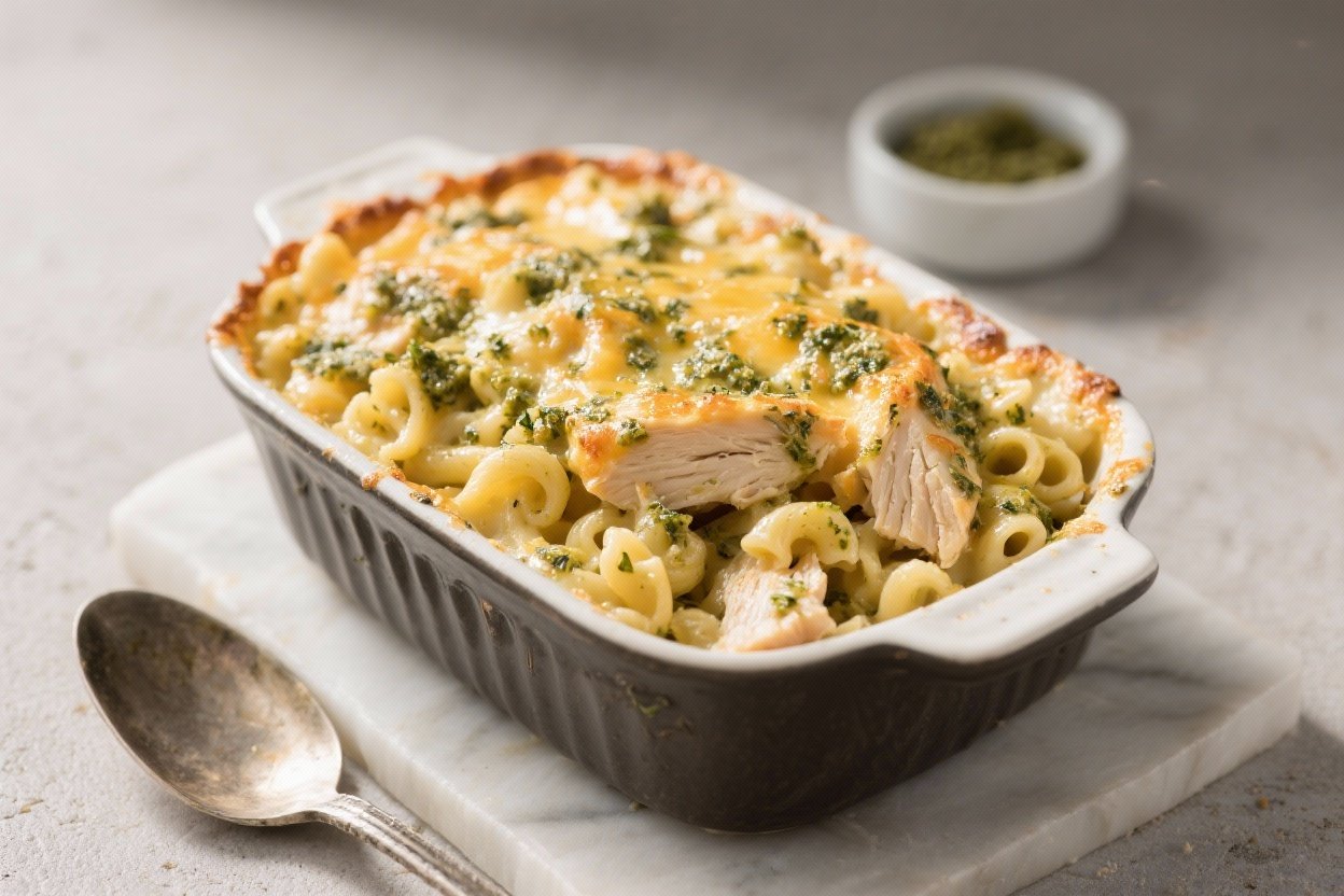 Think of this Baked Chicken Pesto Mac & Cheese as a smarter, greener comfort classic. It’s easy enough for weeknights, special enough for company, and friendly to swaps and add-ins.