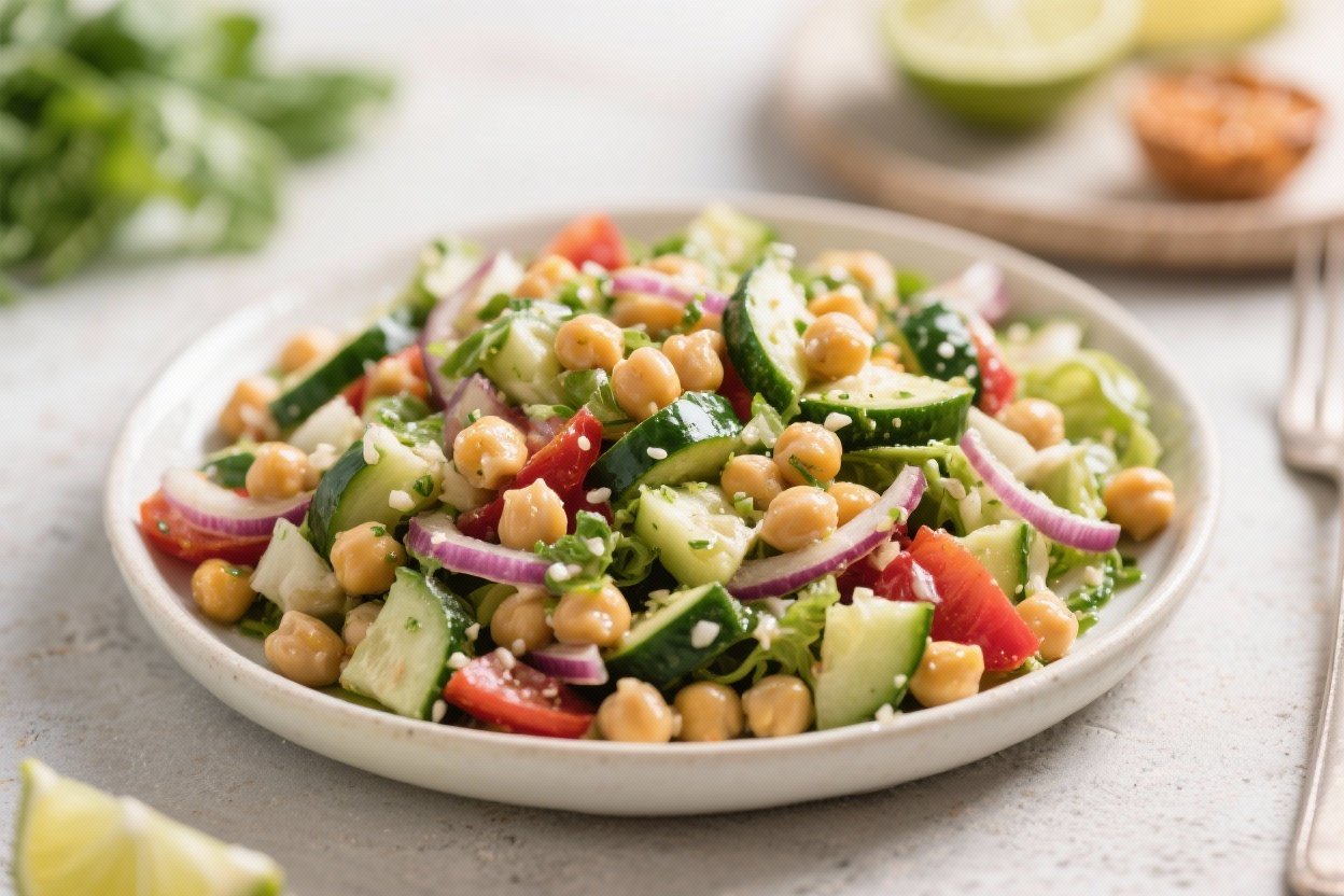 This is the kind of lunch you can throw together in 10 minutes and feel genuinely good about eating. No stove, no oven, no fuss—just a bowl, a can opener, and a knife. Chickpeas bring the protein, crisp veggies add crunch, and a bright lemon-olive oil dressing ties everything together.