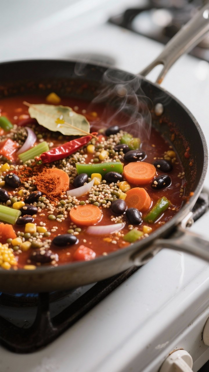 This chili combines three protein-rich ingredients—beans, lentils, and quinoa—to create a complete and hearty meal without meat. Each ingredient plays a role: beans bring creaminess, lentils add body, and quinoa provides a light, slightly nutty bite.