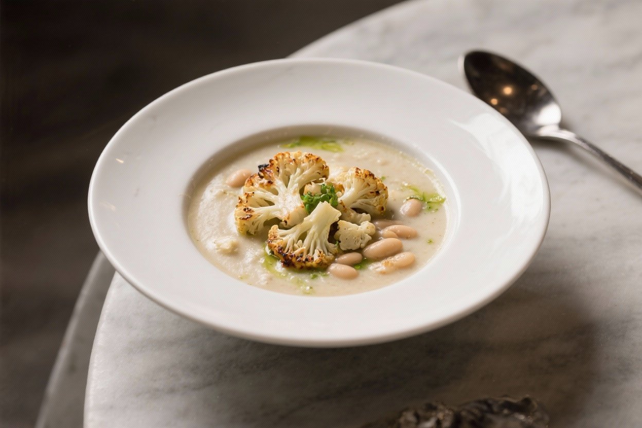 Final dish top view: Overhead shot of a bowl of Roasted Cauliflower & White Bean Soup, ultra-smooth
