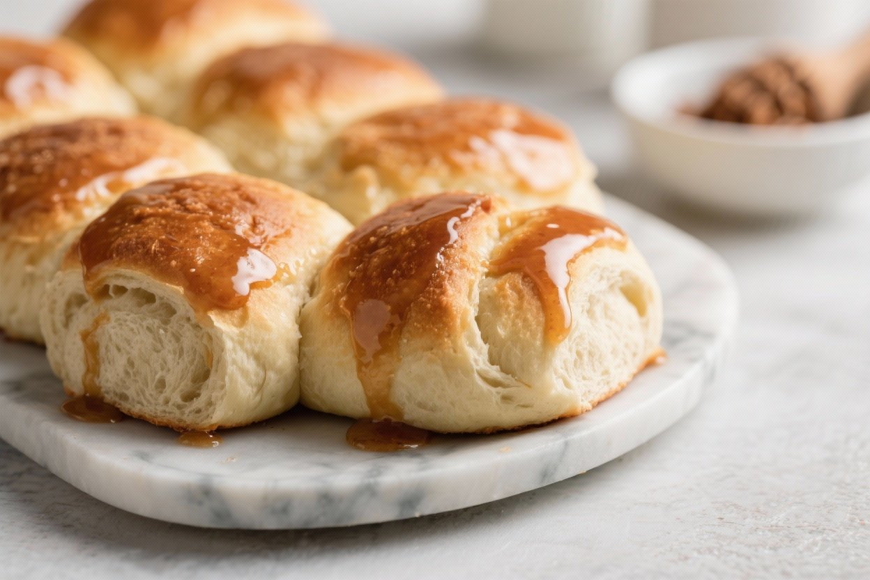 Final dish presentation: Beautifully plated warm sourdough discard maple glazed rolls arranged on a