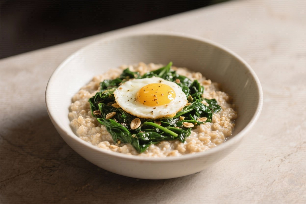 You’ve got creamy oats, silky spinach, and a crisp-edged egg. Finish with cracked pepper, chili oil, or toasted seeds and you’ve built a legit restaurant-style bowl at home in under 10 minutes. Who needs a brunch line?